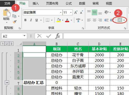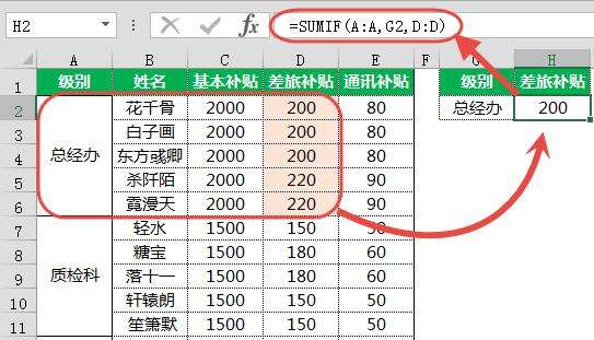 如果对A列的数据按部门进行合并单元格,在H2单元格使用公式来计算指定部门的差旅补贴。