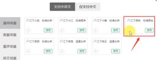 4、接着,选择语音类型,有五大场景可选择,在选择使用前,可以点击“试听”下效果,之后,点击“使用”