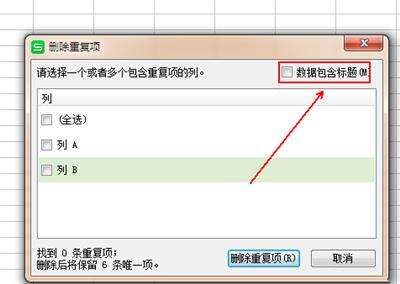 4、在“删除重复项”窗口中勾选“数据包含标题栏”选项。