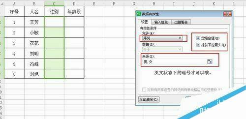 允许选择序列,右边划上钩,来源选择男,女,逗号是英文状态下的逗号标示