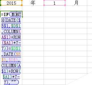 3、在B3单元格里编辑公式“=IF(MONTH(DATE($B$1,$D$1,COLUMN(A$1)+ROW($A1)*7-7))=$D$1,DATE($B$1,$D$1,COLUMN(A$1)+ROW($A1)*7-7),"")”。设置单元格格式为:自定义-“d"。