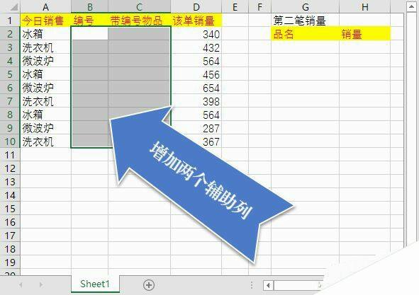 为了便于识别和引用,我们给这个表格添加两个辅助列,其中B列为物品的编号,另一列C则是编号与物品合并生成的带编号物品(具有唯一性)。