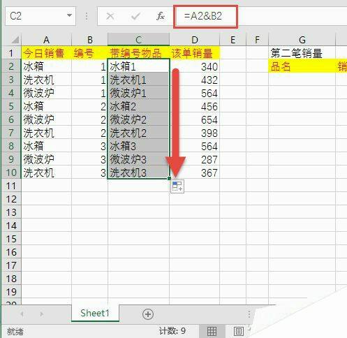 接下来,在C2单元格中输入公式“=A2&B2”,同样用下拉右下角填充柄的方式填充该列。