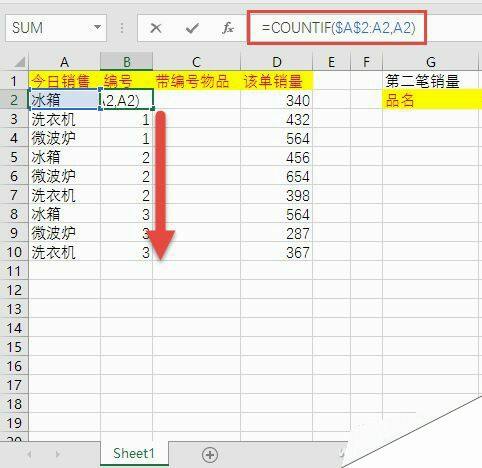 在B2单元格中输入公式“=COUNTIF($A$2:A2,A2)”,然后用下拉右下角填充柄的方式填充该列。作用是自动填充每笔所属的笔数序号。