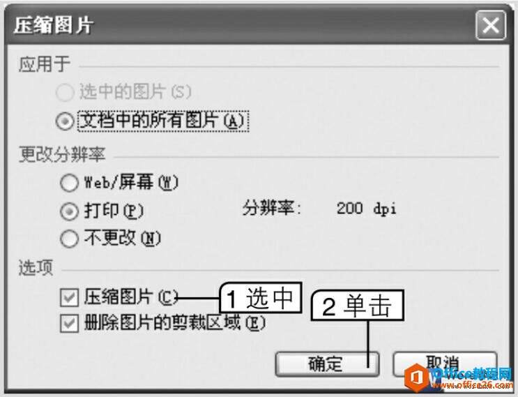 3、打开“压缩图片”对话框,选中“压缩图片”复选框,其他参数一般使用默认设置,单击确定按钮,如图2所示。
