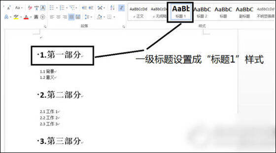选中一级标题,点击样式里的“标题1”,依次将所有的一级标题进行设置,如下图所示。