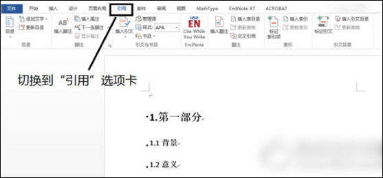 在所有标题的样式设置完成之后,就可以添加目录了,将光标定位到要添加目录的地方,word选中“引用”选项卡,如下图所示。