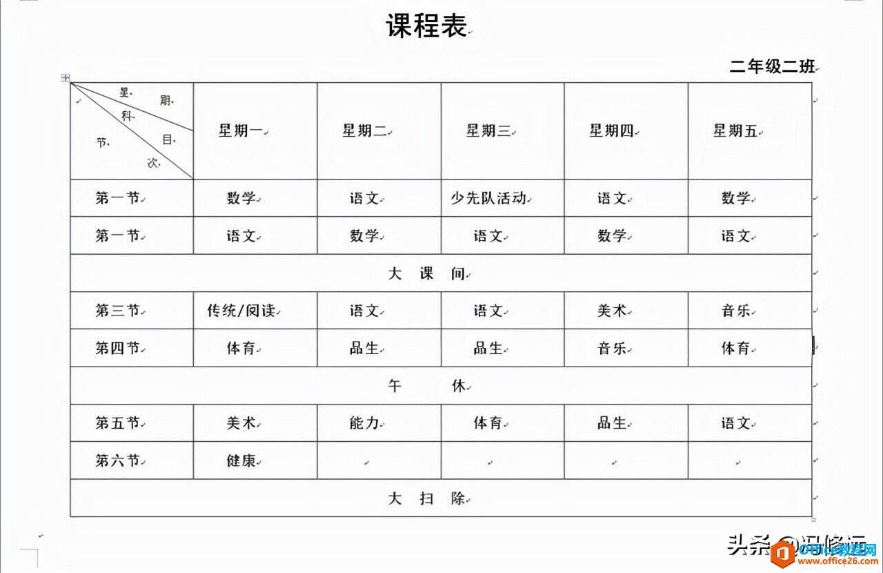 这里比较简单,就不一一演示操作了,如果不会的同学,可以看我之前写的《「冯修远」计算机入门0基础教程:Word文档的段落格式操作》。这里输入内容:“课程表”黑体,一号,居中。“二年级二班”黑体,三号,右对齐。完成后效果如下图所示。然后回车,换行后记得再设置下左对齐。