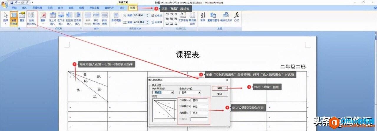 由于斜线表头所占用的空间比较大,所以,我们可以将第一行的高度统一设置为:3.5厘米。设置方法如下:将光标插入表中的第一行第一列,然后在“表格工具布局”的“单元格大小”选项组中,高度设置为3.5厘米。操作步骤和实现效果如下图所示。