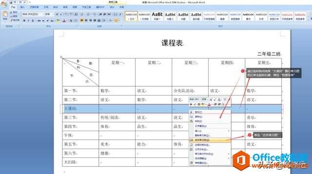 剩下的操作就比较简单了,我们可以参照文本中的”完成后的效果图“在表格中的单元格中输入课程表的内容,字体使用宋体4号,居中。输入完后效果如下图所示。