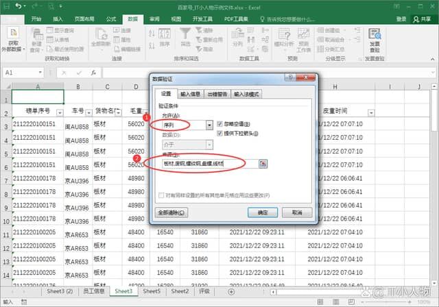3、选择【序列】,在来源中输入选项名称“板材,废钢,螺纹钢,盘螺,线材”,下拉选项就做好了;