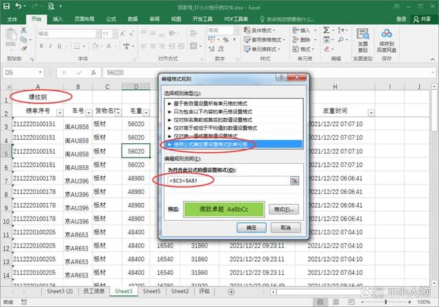 5、在“编辑格式规则”界面中,选择最后一条,然后输入公式“=$C3=$A$1”,选择填充的格式颜色,并确定;