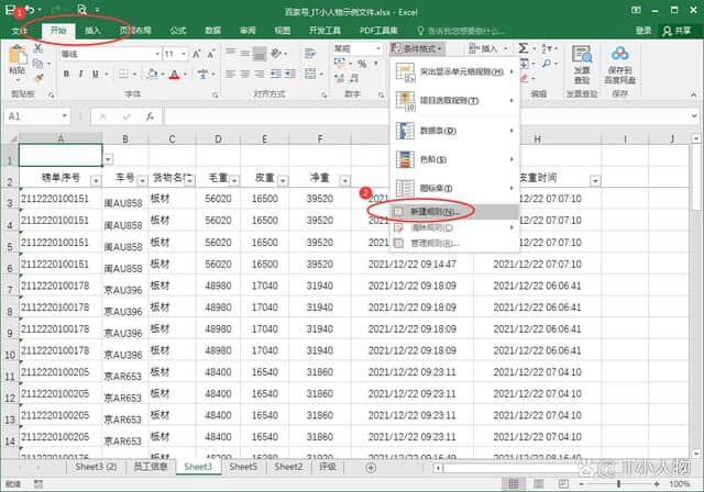 4、选中表格数据后,再点击【开始】-【条件格式】-【新建规则】;