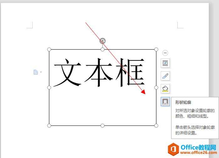 第二步,去除掉周围的黑色边框,将鼠标移动到文本框里,单击激活,在文本框右边出现一列按钮,选择“形状轮廓”,选择“无线条颜色”: