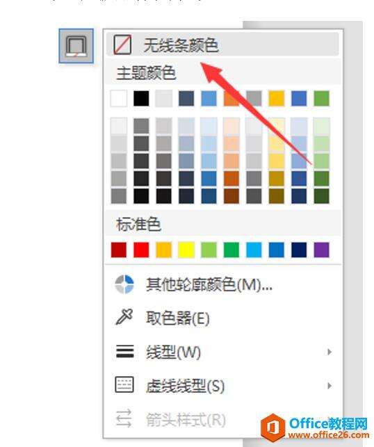 第三步,在形状轮廓编辑面板上,选择“无线条颜色”,这样文本框周围的黑色边框就被去除掉了:
