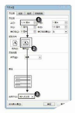 2、在“页边距”选项卡中对页边距进行设置,将纸张方向设置为“横向”,同时在“应用于”下拉列表中选择“插入点之后”选项,如图2所示。