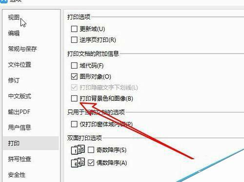 然后在右侧的窗口中找到“打印背景色和图像”的设置项,选中该设置项前面的复选框。