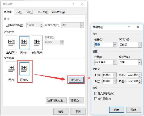 如果想要精确定位表格与文字的距离位置,可在表格上右击,在弹出的菜单中选择“表格属性”命令,打开“表格属性”对话框,在“表格”选项卡下的“文字环绕”栏选择“环绕”选项,然后单击“定位”按钮,在打开的“表格定位”对话框中可设置表格距正文的上、下、左、右距离以及水平、垂直位置。