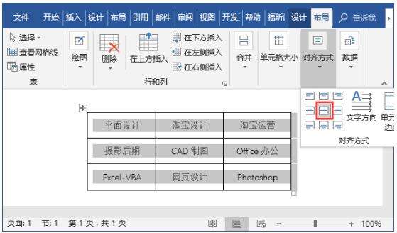 比如,我们想将表格中的文字调整到单元格的中间位置,只需选择表格或需要设置的单元格,点击【表格工具】-【布局】-【对齐方式】组,选择“水平居中”对齐方式即可。