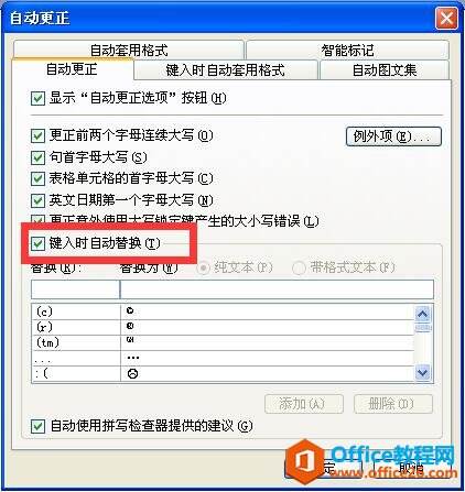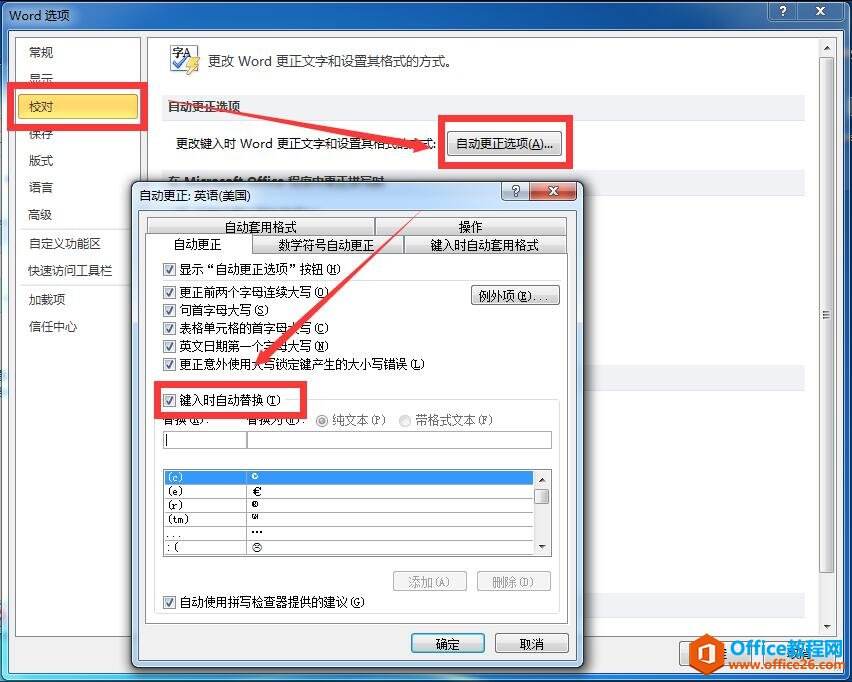 打开【word选项】窗口,在【校队】页签的【自动更正选项】栏下单击【自动更正选项】按钮,在弹出的【自动更正:英语(美国)】对话框中,在【自动更正】tab页面查看【键入时自动替换】是否勾选上