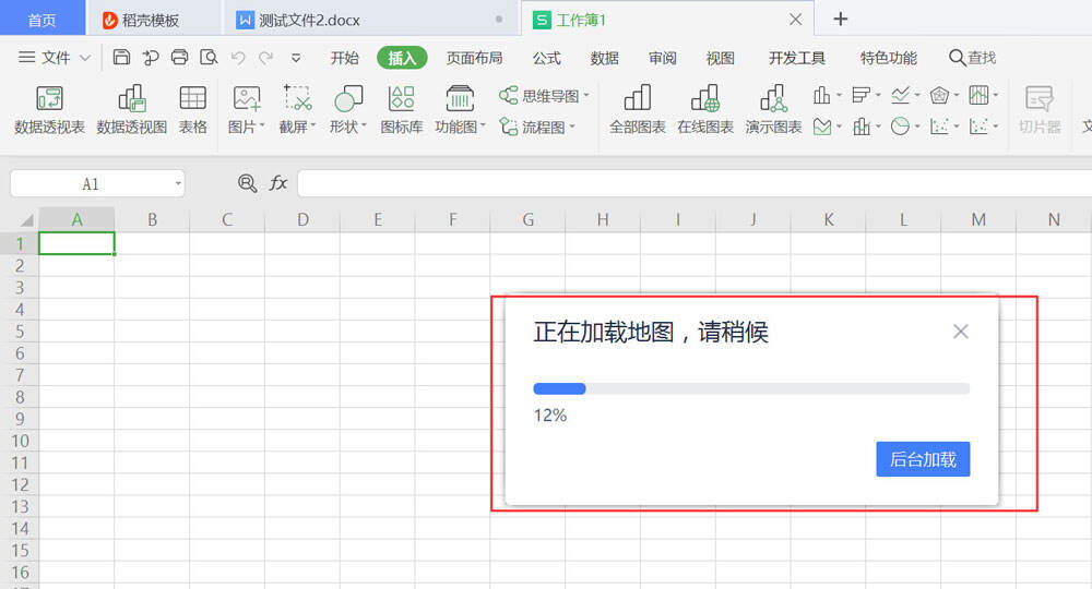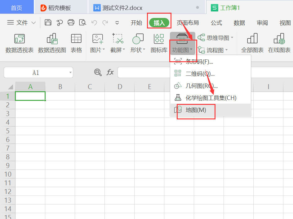 在文档顶端工具栏点击插入、功能图、地图;
