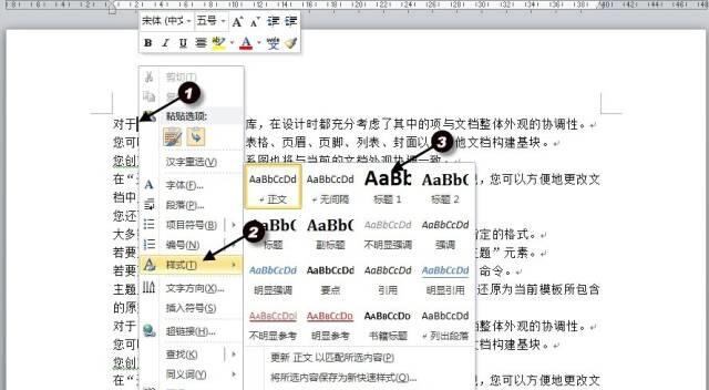 如图所示,将光标放置在段落中,单击鼠标右键→“样式”按钮→选择“标题1”样式,当前段落样式变成“标题1”。