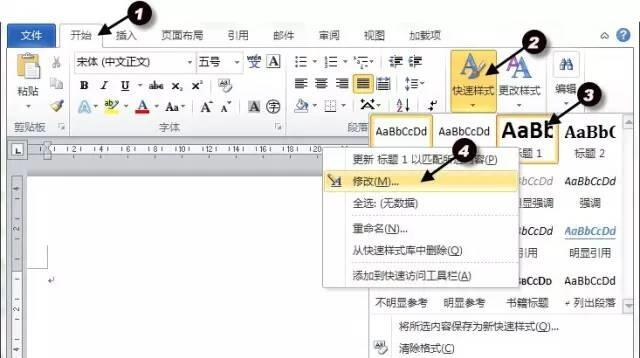 步骤1 如图所示,单击“开始”选项卡→“样式”组→“快速样式”按钮→在“标题1”样式上单击鼠标右键,打开下拉菜单→单击“修改”按钮。
