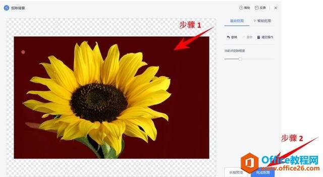 点击后弹出“抠除背景”对话框,鼠标点击需要扣除的背景,点击后能看到红色区域是我们需要扣除的背景,然后点击“完成抠图”。同时我们也可以点击下方“长按预览”先进行查看: