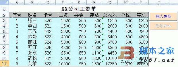 操作非常简便,需要生成工资条的时候,只要点插入表头就可以把第一行和第二行作为表头插入到每个人工资数据行的前面,打印完工资单点删除表头就可以去掉表头,恢复到上图的格式,便于存档。宏的代码特别简洁,执行效率也特别高,推荐使用。