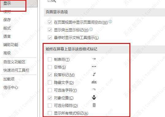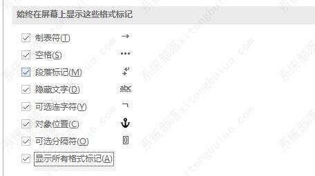 3、在显示选项下方你可以看到“始终在屏幕上显示这些格式标记”。