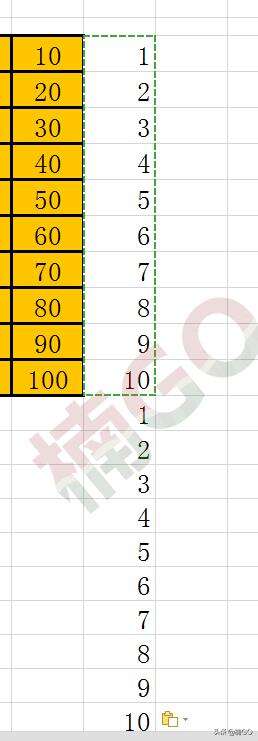 然后,将数字1框选,下拉选框右侧的“小绿点”,至行末。