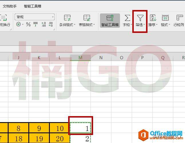 粘贴完毕,重新点击数字1的单元格,选择“筛选”功能。