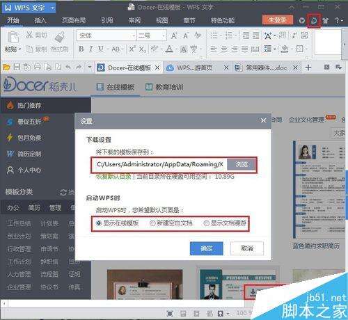 2、在下图的右下角红色框中的“下载 设置 反馈”,选择“设置”可以修改模板的存放路径(可以按照自己的喜好修改)和WPS的启动画面(要关闭在线模板,选择“新建空白文档”)。其配置如下图,按”确定“后,在线模板功能就被关闭了。关闭软件,再次打开将没有在线模板了。