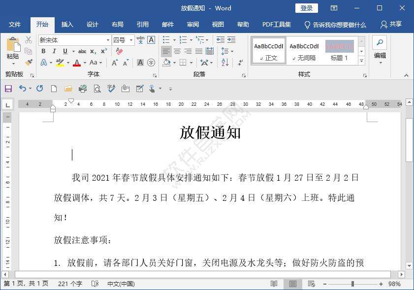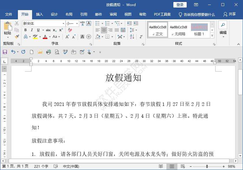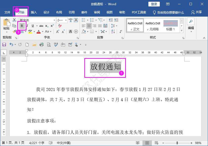 3、这样就可以给放假通知的内容加粗字体了,效果如下: