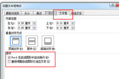 3、然后我们在格式中选择【文本框】,在选项中勾选【Word在自选图形中自动换行】和【重新调整自选图形以适应文本】。