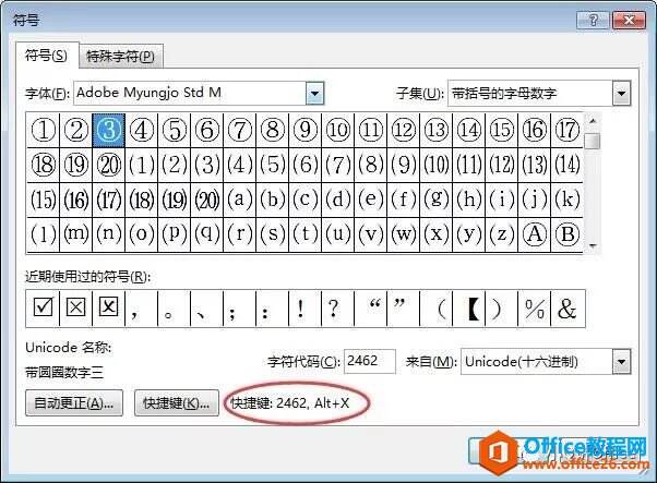 这个方法是直接在Word文档中输入快捷键按钮,比如我们要输入的带圈字符1,那么我们先输入普通数字2462,再按下组合键Alt+X,即可直接显示带圈数字3。