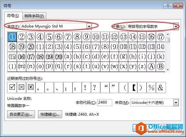 直接插入的方法,是在Word文档中进入【插入】-【符号】-【其他符号】,在字体上选择【Adobe Myungjo Std M】,在子集上选择【带括号的字母数字】,这样就可以看到带圈数字,直接选中需要的数字,点击【插入】即可。
