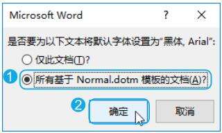 Step02 确认要应用的文档。打开提示框询问将默认字体应用到哪种类型的文档,选中【所有基于Normal.dotm模板的文档(A)】单选按钮;然后单击【确定】按钮即可,如下图所示。