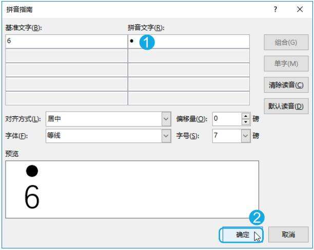 Step02 执行添加拼音指南操作。选 择【•】,按【Ctrl+C】组合键进行复制;选择数字【6】;在【开始】选项卡的【字体】组中单击【拼音指南】按钮 ,如下图所示。