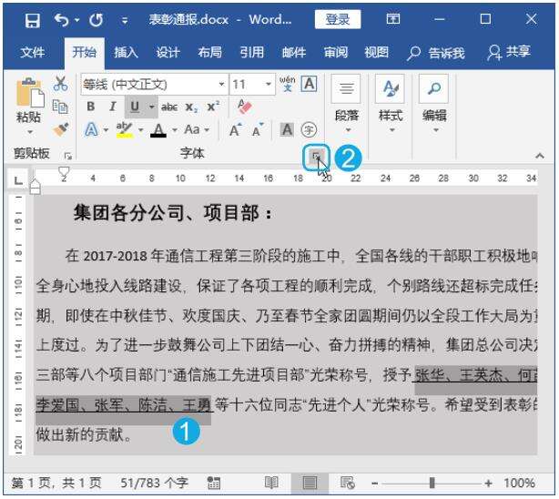 Step01 单击【功能扩展】按钮。打开“案例文件\表彰通报.docx”文件,选择已经添加下划线的文本;单击【字体】组中的【功能扩展】按钮 ,如下图所示。