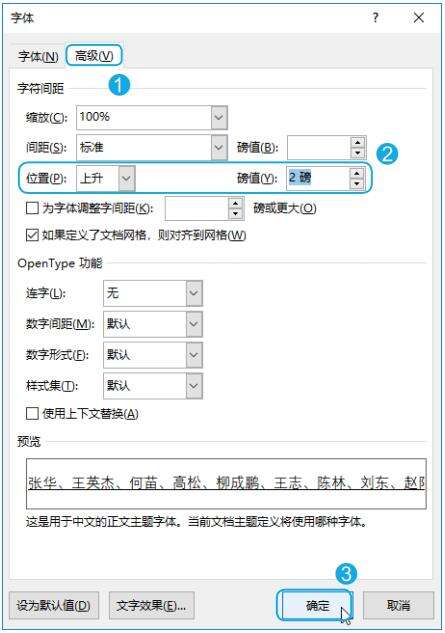 Step02 设置字符位置。打开【字体】对话框,选择【高级】选项卡;在【位置】下拉列表中选择【上升】选项,在右侧的【磅值】微调框中设置间距大小;设置完成后单击【确定】按钮,如下图所示。