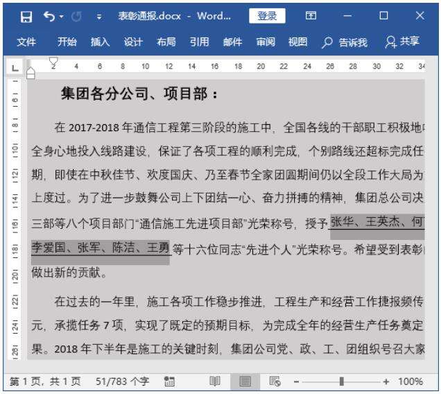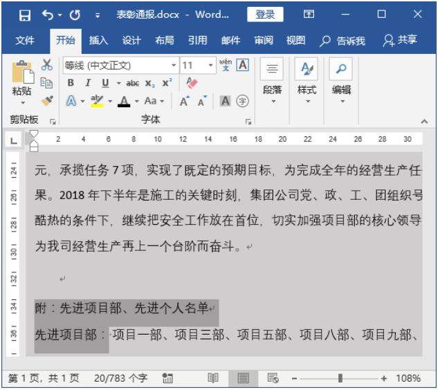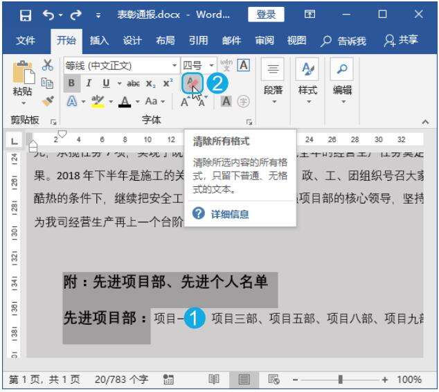 Step01 清除内容所有格式。在“表彰通报.docx”文档中,选择需要清除所有格式的文本;单击【字体】组中的【清除所有格式】按钮 ,如下图所示。