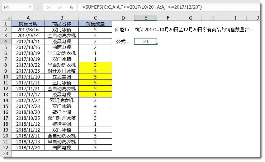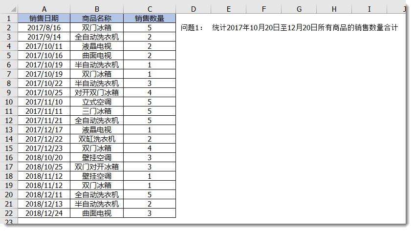 例如要统计2017年10月20日至12月20日所有商品的销售数量合计,其实就是对销售日期大于或等于2017年10月20日,同时销售日期小于或等于12月20日的数据作为求和的条件,再将对应的销售数量求和。