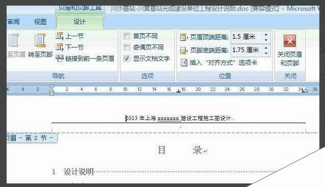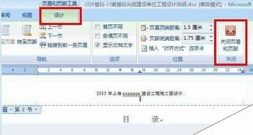 5、在点击菜单栏中的"设计",点击“关闭页眉和页脚”回到文档,我们发现横线已经删除了。