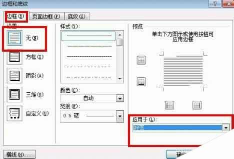 4、在第一项“边框”里选择无,右下角应用于“段落”,点击确定。