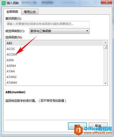在函数对话框内选择“或选择类别”选项,单击“数学与三角函数”,在“选择函数”处用鼠标单击函数ACOSH。此时弹出函数参数对话框。