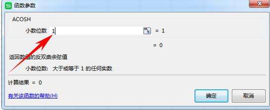 在数值处填写1。填写后单击确定,便可在单元格内看到所求数值的ACOSH函数值。