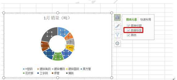 然后我们再点击圆形图右侧最上面第一个快捷工具键,在下拉菜单中点选数据标签,把数据填充到圆形图中,如图3