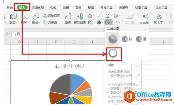 然后我们会发现自己做的饼图好像缺少了点什么,和别人的饼图比起来,简直无法直观。下面我们对这个饼图来做一下改观,选中饼图,点击插入菜单栏下的饼图工具按钮,在下拉菜单中选择圆形图,如图2