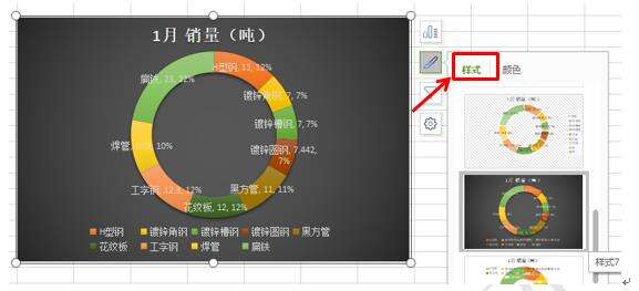 然后我们再点击饼图右侧的第二个快捷工具键,在里面选择颜色和样式,对他们分别进行改变,如图4